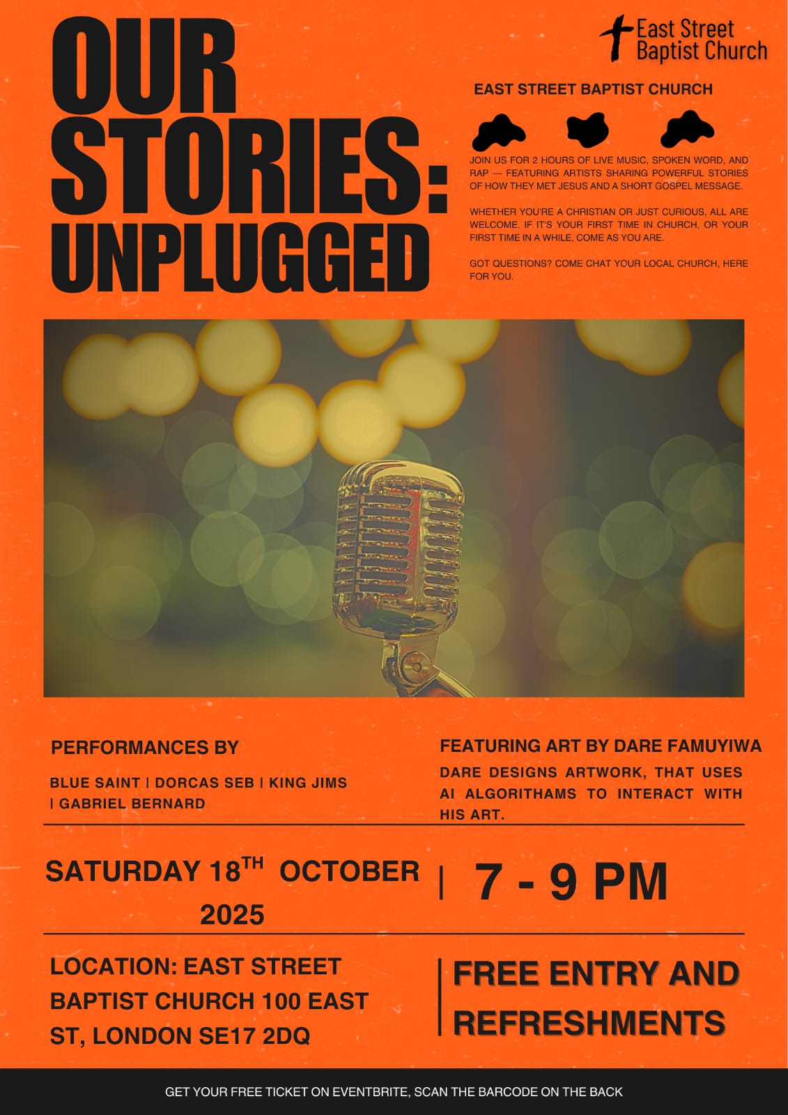 Join us for 2 hours of free live music, spoken word, rap and art featuring powerful stories of how the artists met Jesus. Whether you're a Christian or curious, join us!