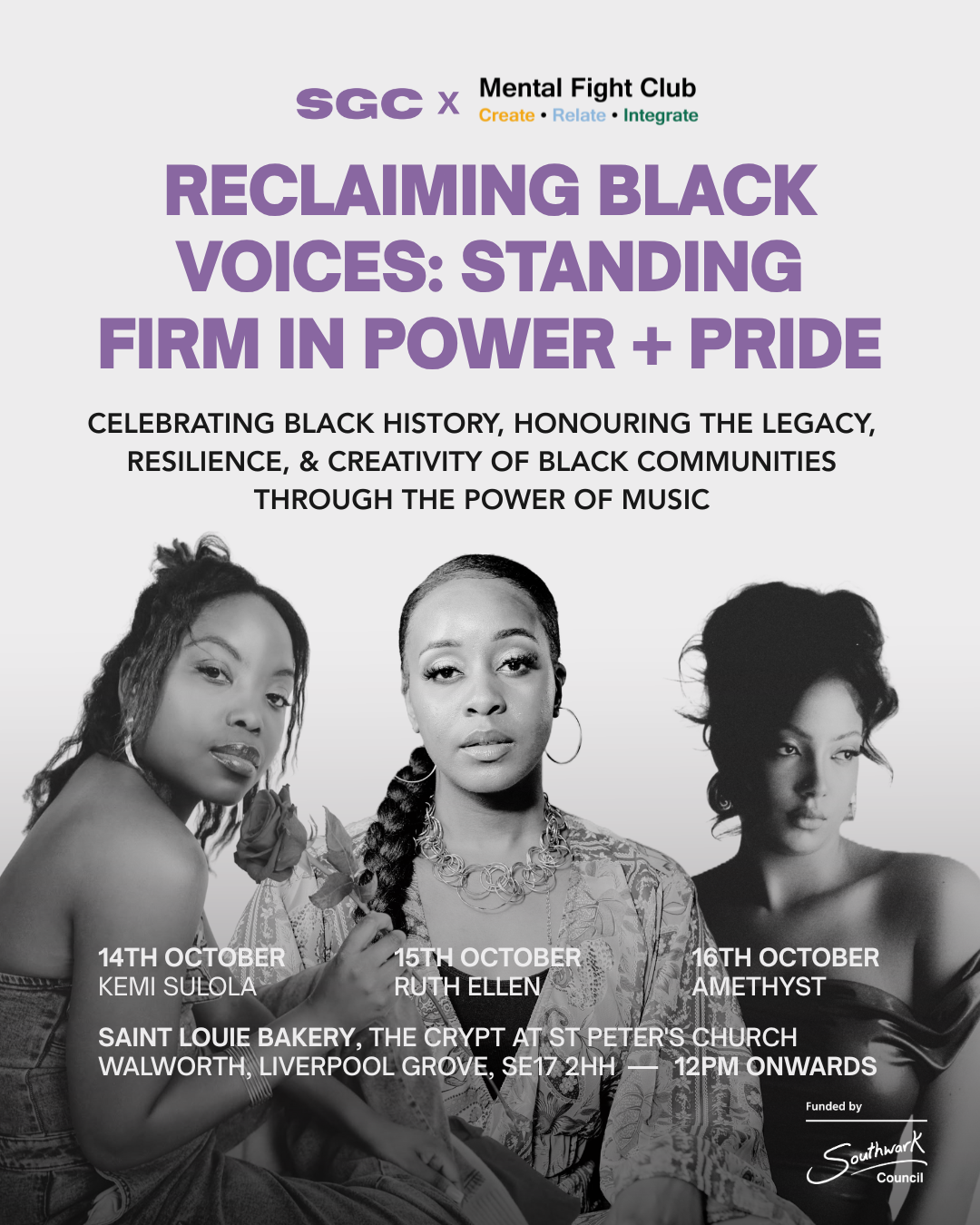 Soulgirl Collective x Mental Fight Club presents: Reclaiming Black Voices: Standing Firm in Power + Pride, a 3-day special showcase honouring the legacy, resilience, and creativity of Black communities through the power of music. Guided by the theme “Standing Firm in Power and Pride,” the program showcases performances that celebrate cultural heritage, amplify voices of strength, and highlight the role of music as a force for unity and empowerment.