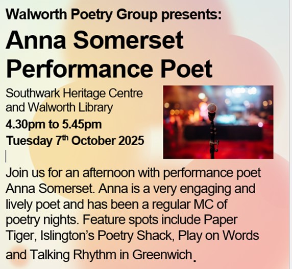 Walworth Poetry Group meet again to hear performance poet Anna Somerset perform at our stair place at Southwark Heritage Centre and Walworth Library.